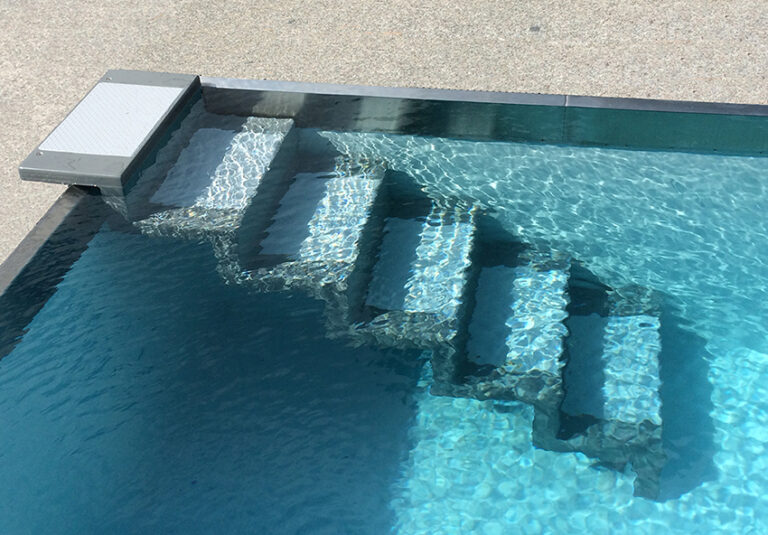 Die REKU Treppe ELEGANZ ist sehr flexibel im Becken positionierbar.
